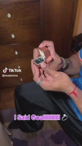 В своем тиктоке Медж опубликовала видео, в котором разыграла сцену помолвки. В ролике ее бойфренд становится на колено и держит в руках кольцо, а певица с притворным изумлением примеряет украшение. Затем оказывается, что это – обычный брелок в виде футбольного мячика. После этого Мадонна показывает средний палец, давая понять, что вся ситуация – лишь шутка.