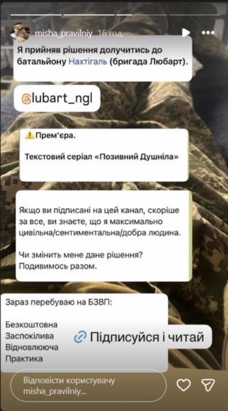 В итоге, выбирая между обходом закона и его исполнением, Миша Правильный решил пойти в армию по собственному желанию. В инстаграм-сторис певец рассекретил, что проходит базовую военную подготовку, а затем присоединится к бригаде Любарт в составе батальона Нахтигаль.