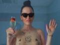 Артистка выбрала для съемки комплект телесного цвета, что в сочетании с полупрозрачной тканью создает "голый" эффект.